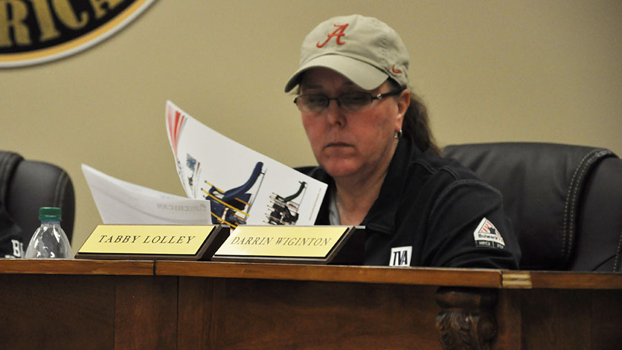 Hackleburg Town Councilwoman Tabby Lolley looks through a catalog prior to a vote by the council to purchase a new set of playground equipment for the town park.>