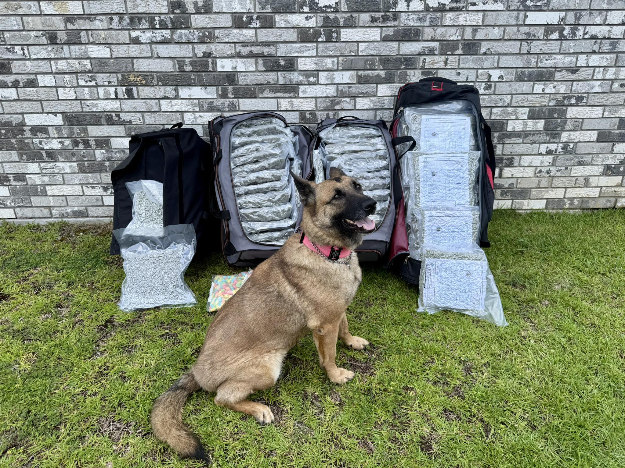After K-9 Bella gave a positive indication to the odor of illegal narcotics, a search of the vehicle revealed five bags of THC gummies and four duffle bags stuffed with marijuana — totaling approximately 150 lbs. of marijuana and 30 lbs. of THC edibles.
